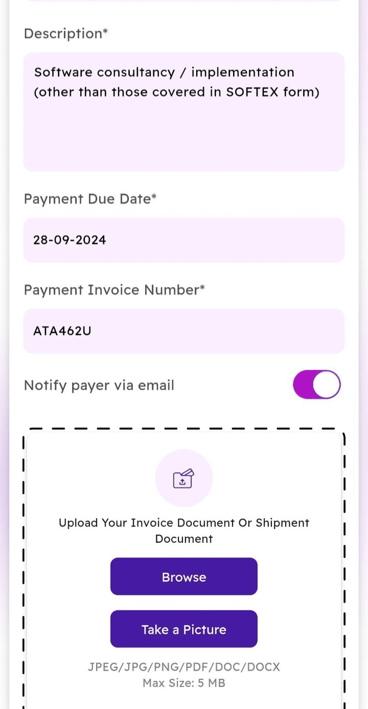 - Upload your invoice: You can either upload the invoice from your phone or take a photo instantly depending on your convenience. Remember that the maximum file size is 5 MB.