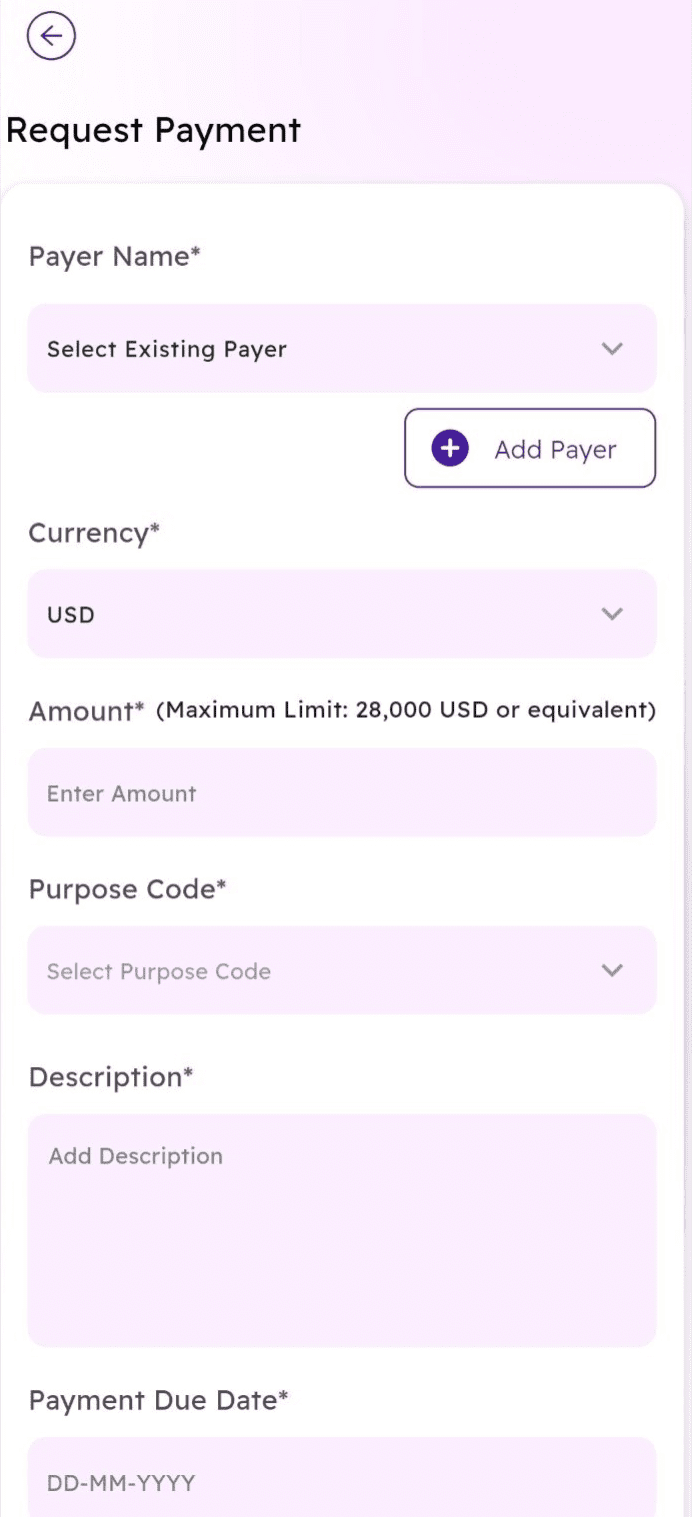 - Enter transaction details: After choosing “Payment Requests”, a new page will appear where you need to enter payer details such as their name, currency, amount, purpose code, description of the international payment you would receive, and payment due date.