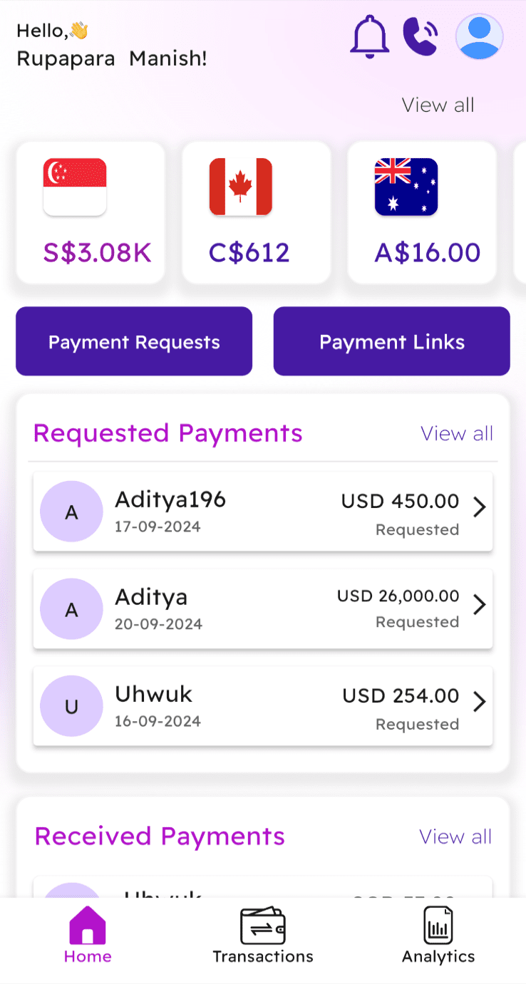 - Payment requests: To receive your international payment, you need to create a request by clicking on “Payment Requests” option provided on the homepage of our application.