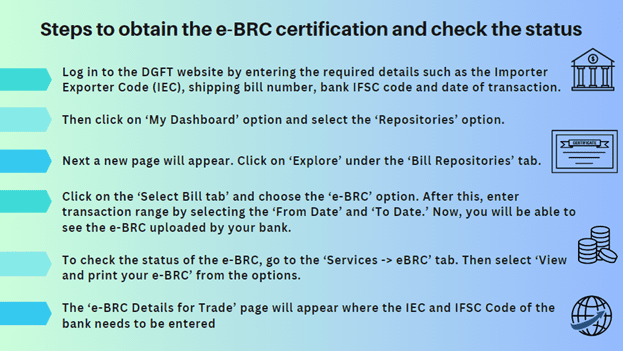 The e-BRC is a digital version of the certificate. The introduction of e-BRC put an end to the time-consuming preparation of going to the bank to get the certificate issued followed by submitting it by going to the Directorate General of Foreign Trade’s (DGFT) regional branch. Presently, banks naturally issue a computerised e-BRC when the exporter applies for the certificate and receives installments for exporting goods and services in the bank account from abroad.